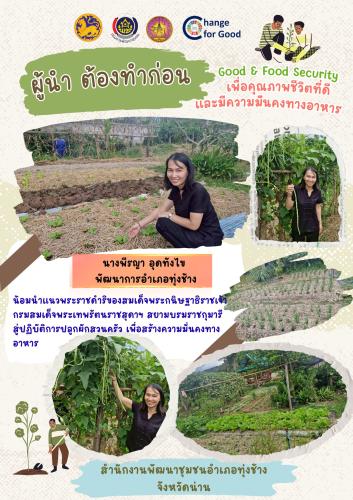 นางพีรญา อุดทังไข พัฒนาการอำเภอทุ่งช้าง น้อมนำแนวพระราชดำริของสมเด็จพระกนิษฐาธิราชเจ้า กรมสมเด็จพระเทพรัตนราชสุดาฯ สยามบรมราชกุมารี สู่ปฏิบัติการปลูกผักสวนครัว เพื่อสร้างความมั่นคงทางอาหาร ภายใต้กิจกรรม "ผู้นำต้องทำก่อน" ขับเคลื่อนกิจกรรมเพื่อคุณภาพชีวิตที่ดีและมีความมั่นคงทางอาหาร (Good & Food Security)