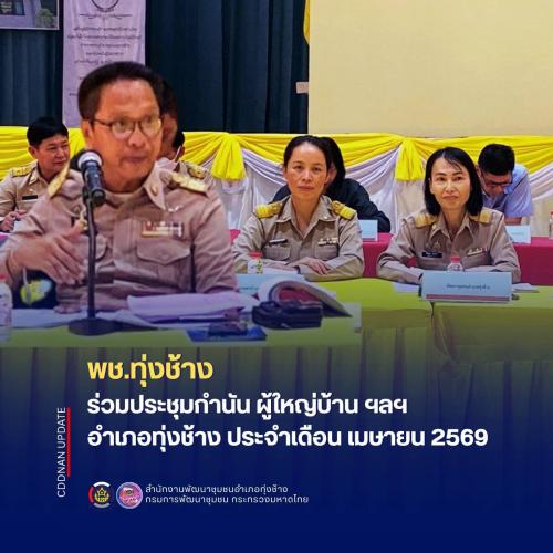 วันพุธที่ 1 เมษายน 2569 เวลา 08.30 น. นางพีรญา อุดทังไข พัฒนาการอำเภอทุ่งช้าง เข้าร่วมประชุม กำนัน ผู้ใหญ่บ้าน ฯลฯ อำเภอทุ่งช้าง ประจำเดือนเมษายน 2569 โดยมีนายทวีศักดิ์ พุ่มมรดก นายอำเภอทุ่งช้าง เป็นประธานการประชุมฯ ในการนี้ สำนักงานพัฒนาชนอำเภอทุ่งช้างได้มีการชี้แจงข้อราชการ ดังนี้